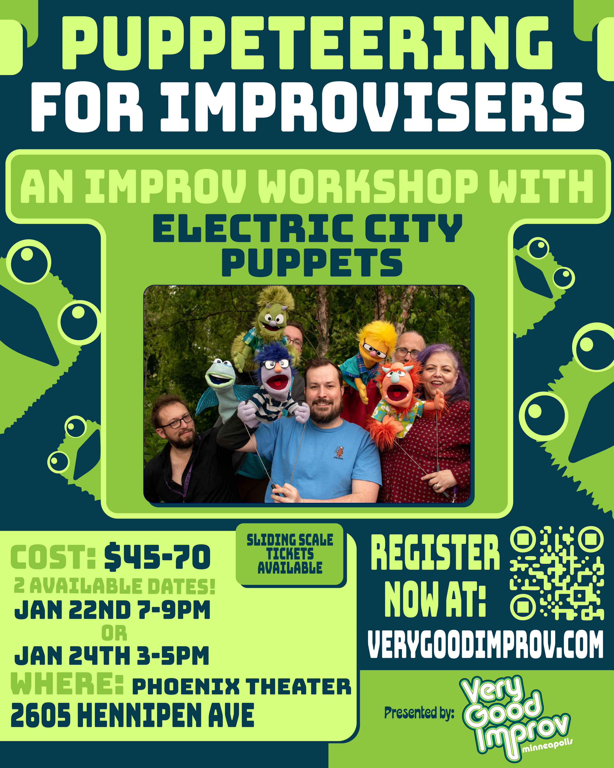 Join Electric City Puppets for a crash course in performing improv with puppets. You’ll learn how to make the most ordinary inanimate objects come to life and delight your audience. Using hand and rod style puppets we'll share our insights on how to meet the unique challenges of improvising with a puppet on stage and explore movement and techniques that you can continue to use in your performances with or without a puppet on your hand. Each participant will receive a set of practice eyeballs to continue their puppeteering journey beyond the classroom!